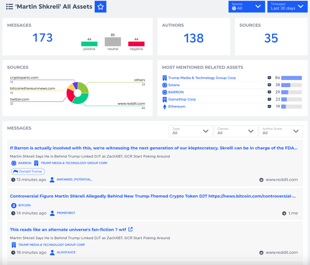 A recent social media search with Stockpulse on “Martin Shkreli” reveals that his name frequently appears in discussions alongside topics such as “Donald Trump,” “Blockchain,” and “Fraud.” This trend reflects ongoing public interest and controversy surrounding Shkreli, particularly in light of his claims about co-creating the DJT token, a cryptocurrency associated with Trump. The recurrent mention of “Fraud” highlights lingering concerns over his past legal troubles and current ventures in the blockchain space. Most mentioned company in relation with this discussion is “Trump Media & Technology Group Corp”.