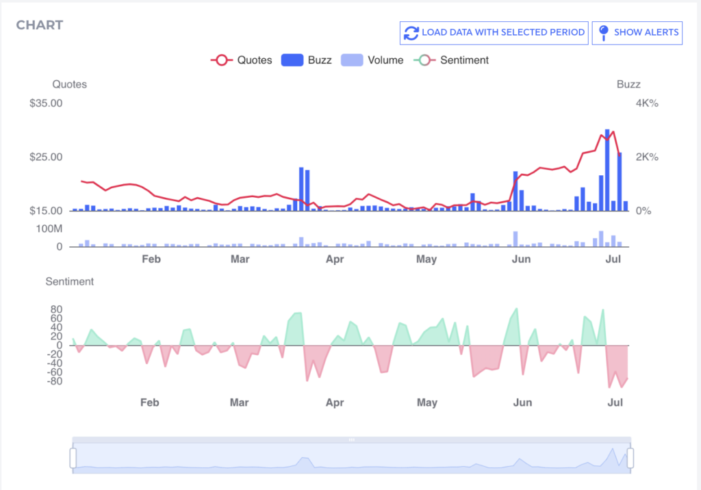 The chart shows Quotes, Buzz, Volume, and Sentiment trends, highlighting significant changes in June and July due to Gill’s involvement.