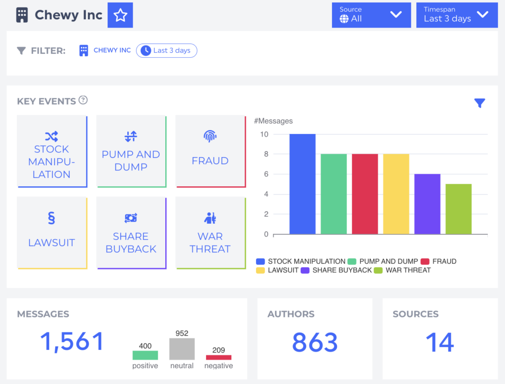 Key events related to Chewy include mentions of stock manipulation, pump and dump schemes, fraud, and more, with 1,561 messages from 863 authors.