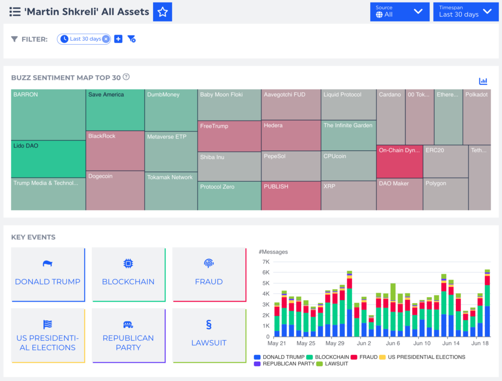 The image displays a heat map of most mentioned assets in relation to the search query “Martin Shkreli” in social media and the news. Cryptocurrencies seem to be predominant. Topics “Donald Trump”, “Blockchain” and “Fraud” are the most mentioned terms in this relation.